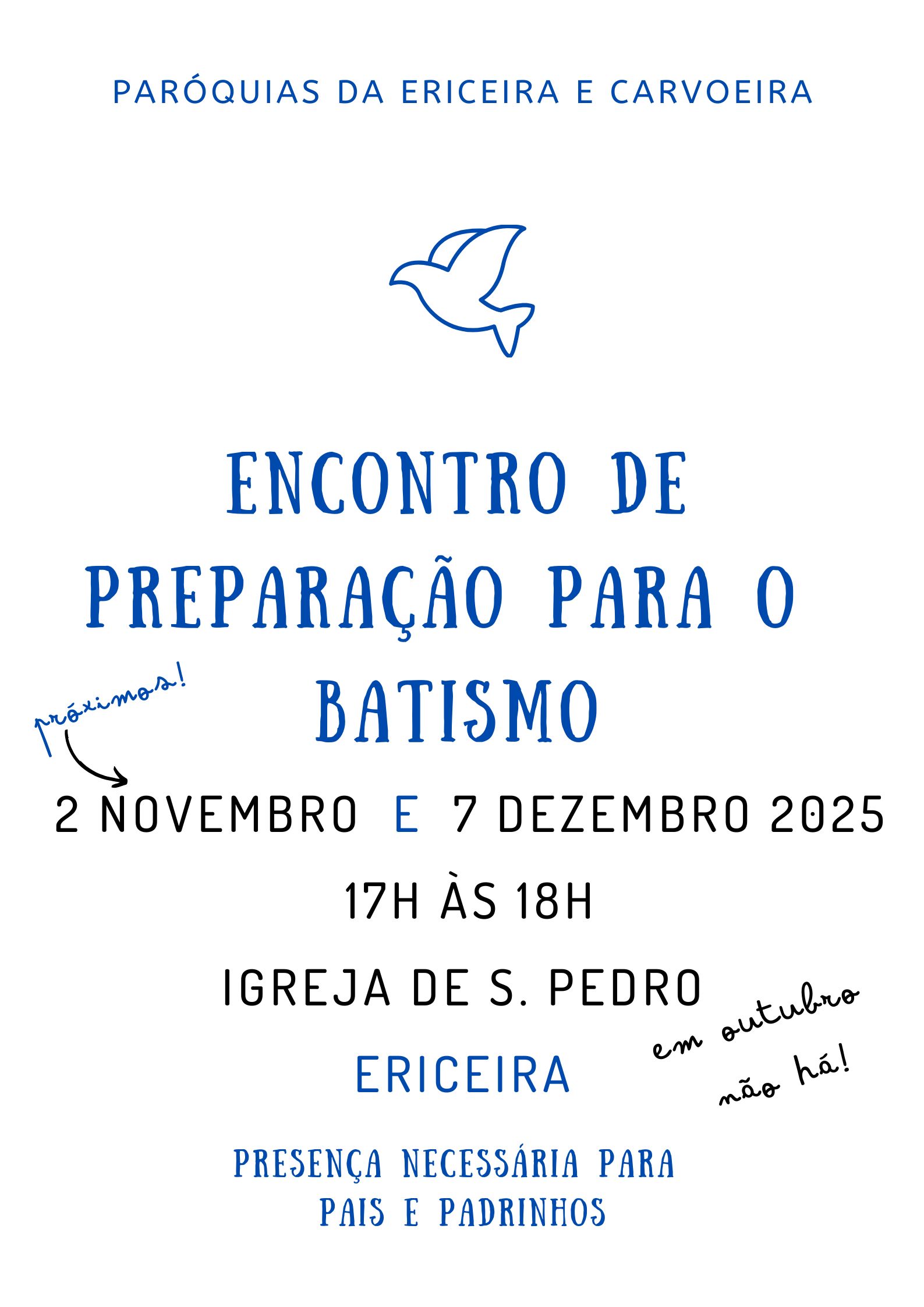 Os próximos Encontros de Preparação para o Batismo serão a 2 de novembro e a 7 de dezembro na igreja de S. Pedro, na Ericeira, entre as 17h e as 18h, para pais e padrinhos. Não é necessária inscrição, basta aparecerem.