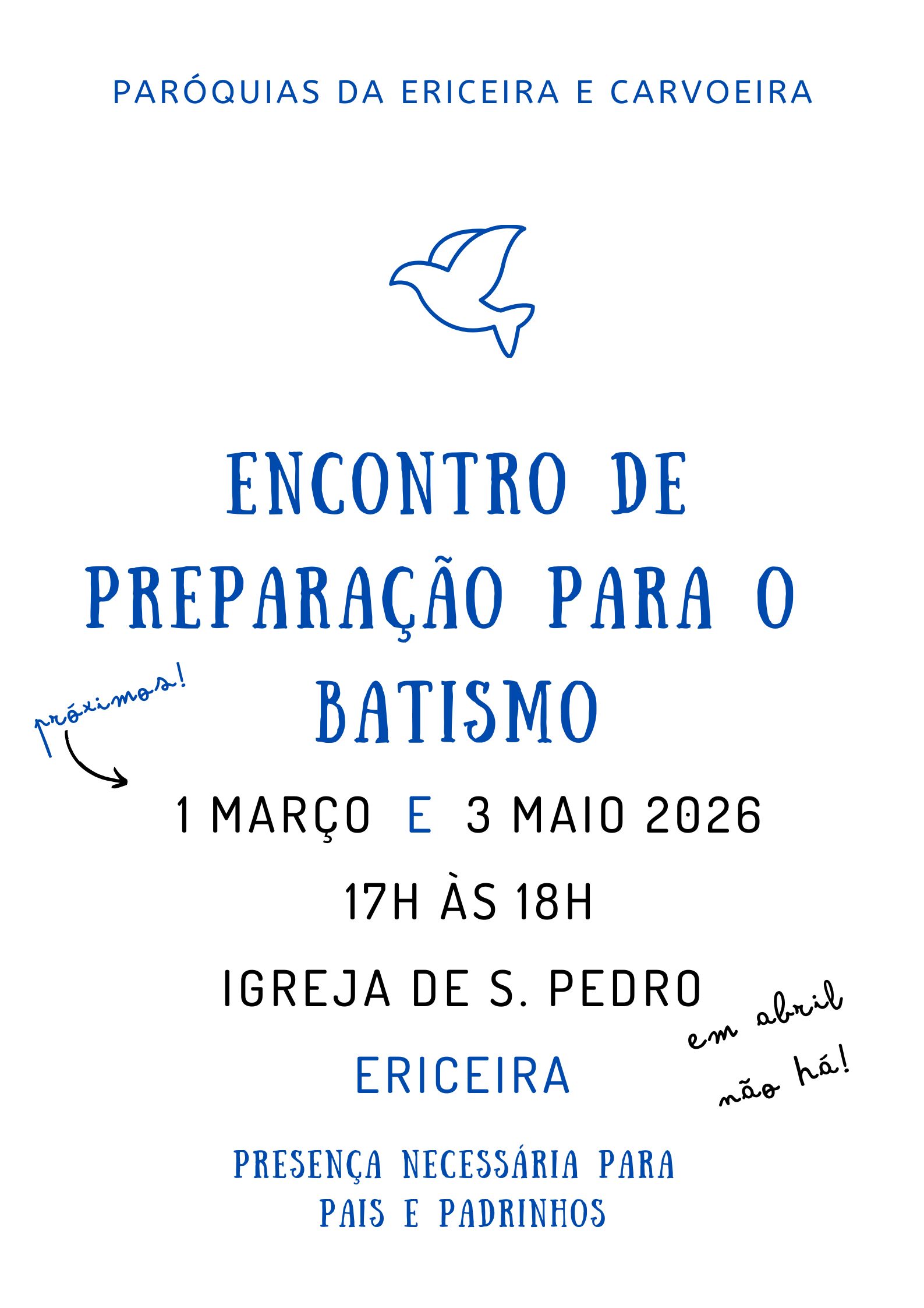 Os próximos Encontros de Preparação para o Batismo serão a 1 de março e a 3 de maio na igreja de S. Pedro, na Ericeira, entre as 17h e as 18h, para pais e padrinhos. Não é necessária inscrição, basta aparecerem.