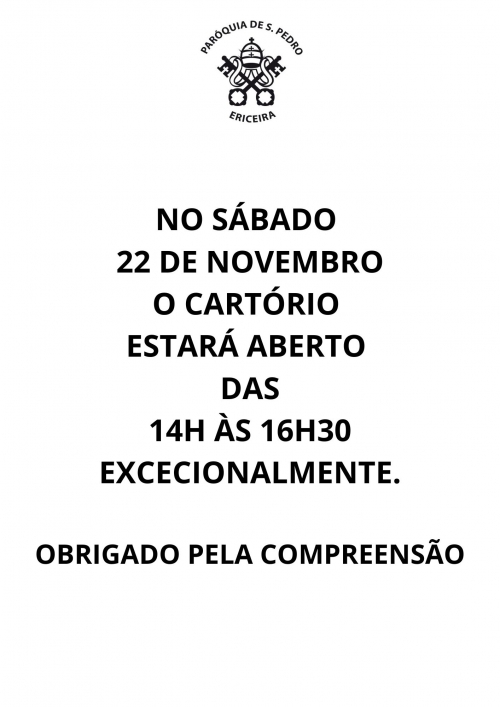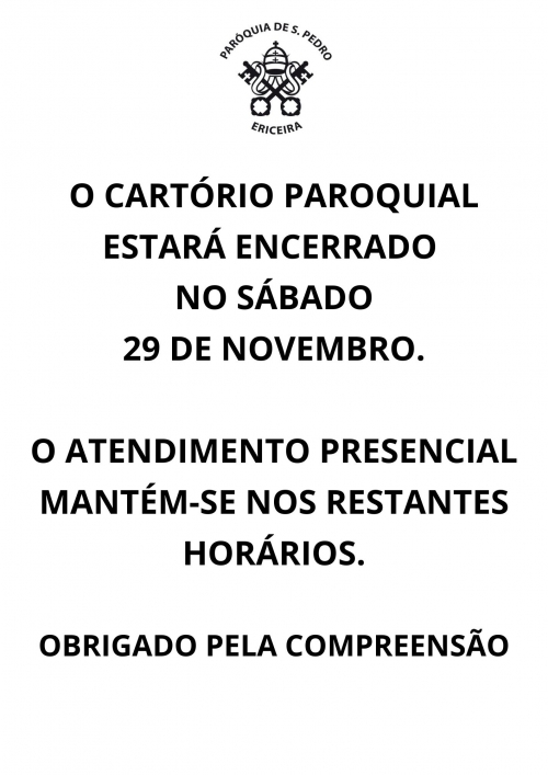 O Cartório Paroquial, no interior da igreja de S. Pedro, na Ericeira, estará em funcionamento na 5ª feira, dia 27 de novembro, das...