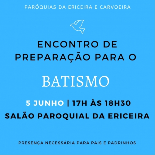 No dia 5 de junho, no 1.º Domingo do mês, há um Encontro de Preparação para o Batismo, para Pais e Padrinhos, no Salão...