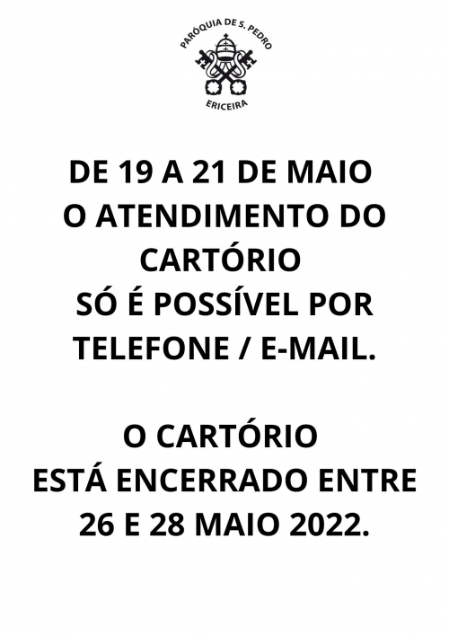 O Cartório Paroquial, no interior da igreja de S. Pedro da Ericeira, encontra-se esta semana, de 19 a 21 de maio, ao atendimento apenas via telefone...