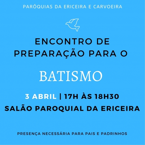 No dia 3 de abril, no 1.º Domingo do mês, há um Encontro de Preparação para o Batismo, para Pais e Padrinhos, no Salão...