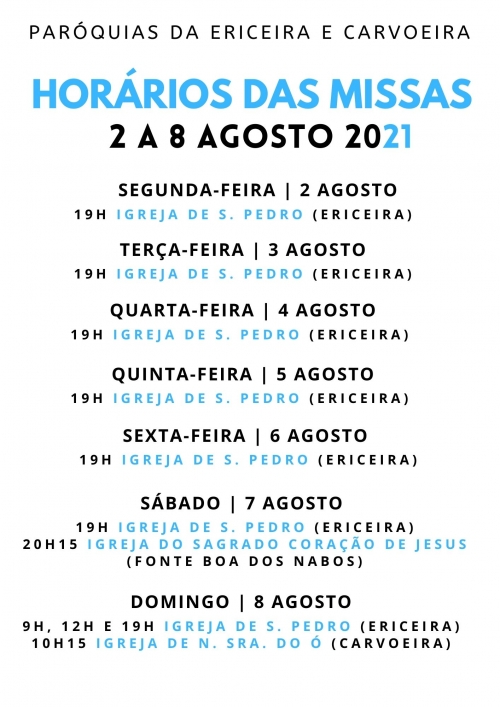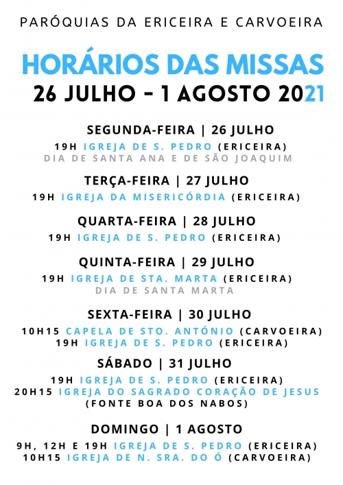 Na semana de 26 de julho a 1 de agosto há algumas alterações, nomeadamente, nas Missas...