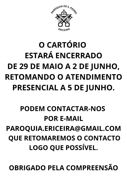 O Cartório Paroquial, no interior da igreja de S. Pedro, na Ericeira, estará encerrado entre 29 de maio a 2 de junho, retomando o atendimento...