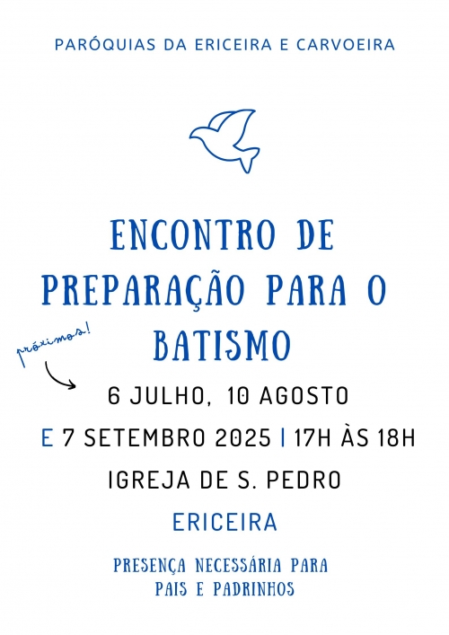 Os próximos Encontros de Preparação para o Batismo serão a 6 de julho, 10 de agosto e 7 de setembro na igreja de S. Pedro,...