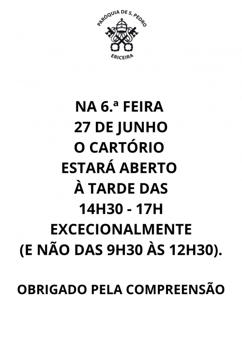 Na 6.ª feira, dia 27 de junho, o Cartório Paroquial, no interior da igreja de S. Pedro, estará aberto à tarde das 14h30 às...