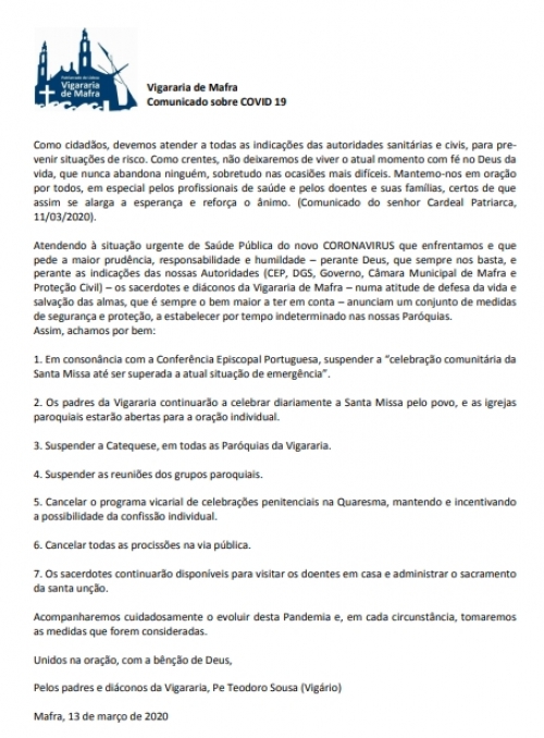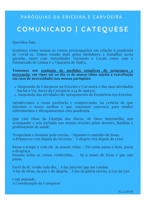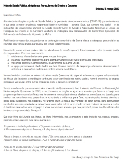 Nota de Saúde Pública, dirigida aos Paroquianos da Ericeira e Carvoeira