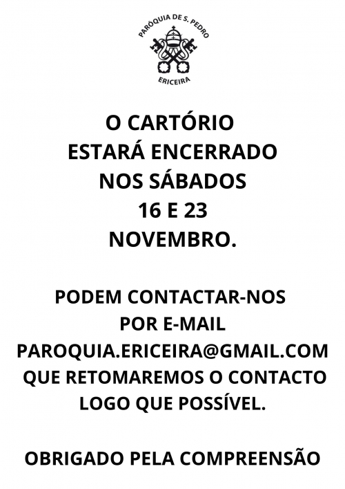 O Cartório Paroquial estará encerrado nos sábados 16 e 23 de novembro. Nestas datas, por favor, contactem-nos através...