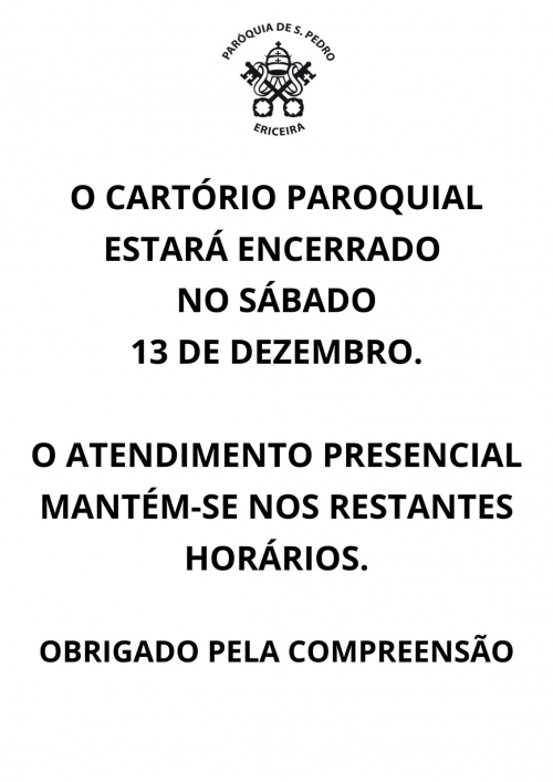 O Cartório Paroquial, no interior da igreja de S. Pedro, na Ericeira, estará encerrado no sábado 13 de dezembro devido à...