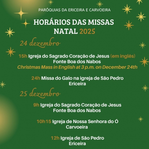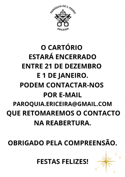 O Cartório Paroquial estará encerrado entre 21 de dezembro e 1 de janeiro. Podem contactar-nos por e-mail paroquia.ericeira@gmail.com...