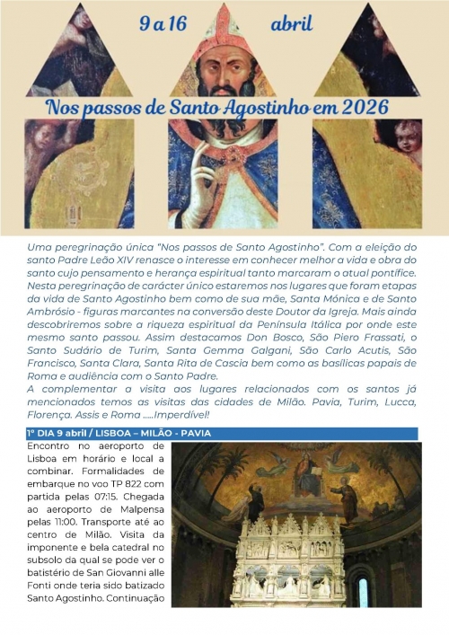 Inscrições abertas para a Peregrinação a Itália em 2026, de 9 a 6 de abril, para seguir os Passos de Santo Agostinho.